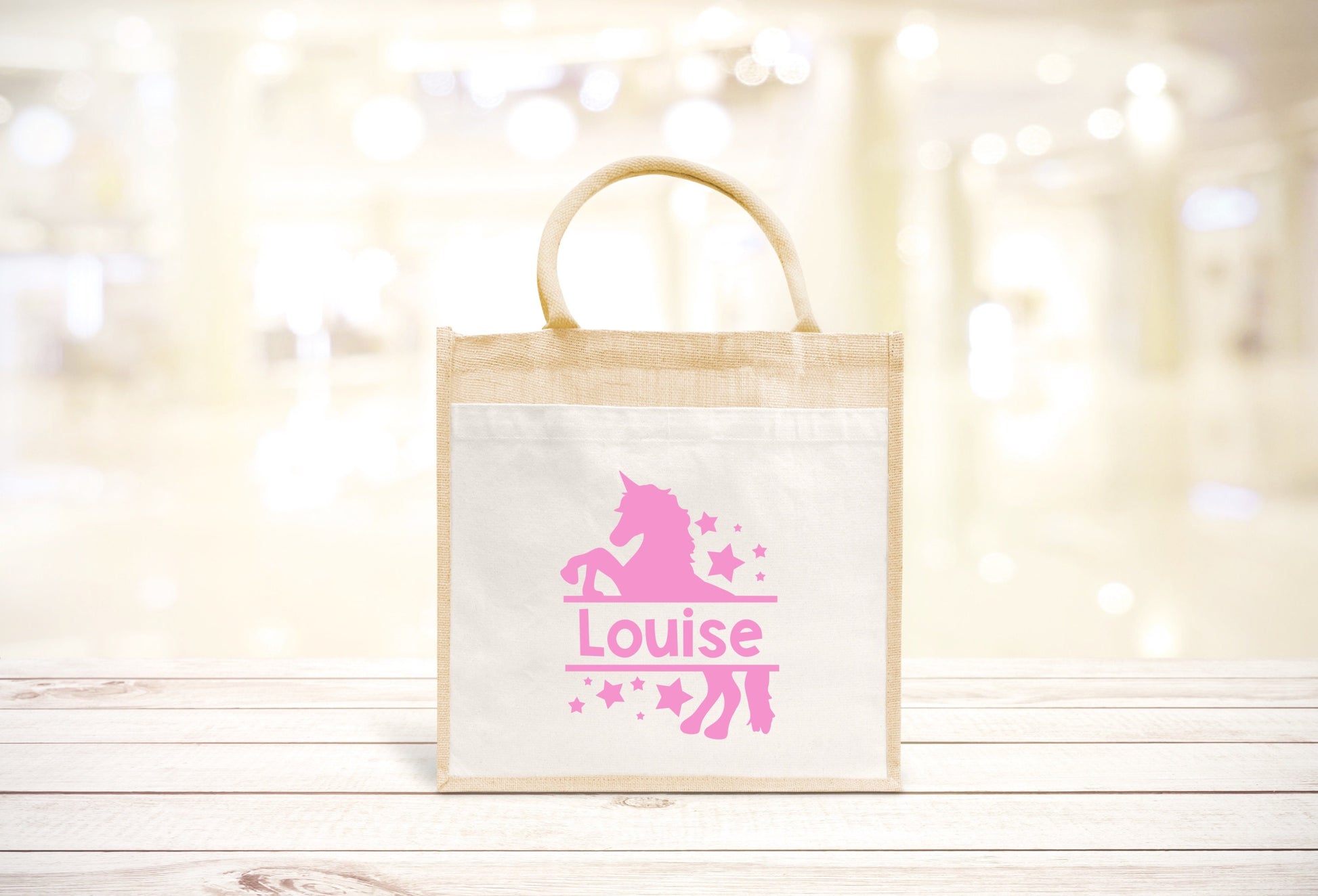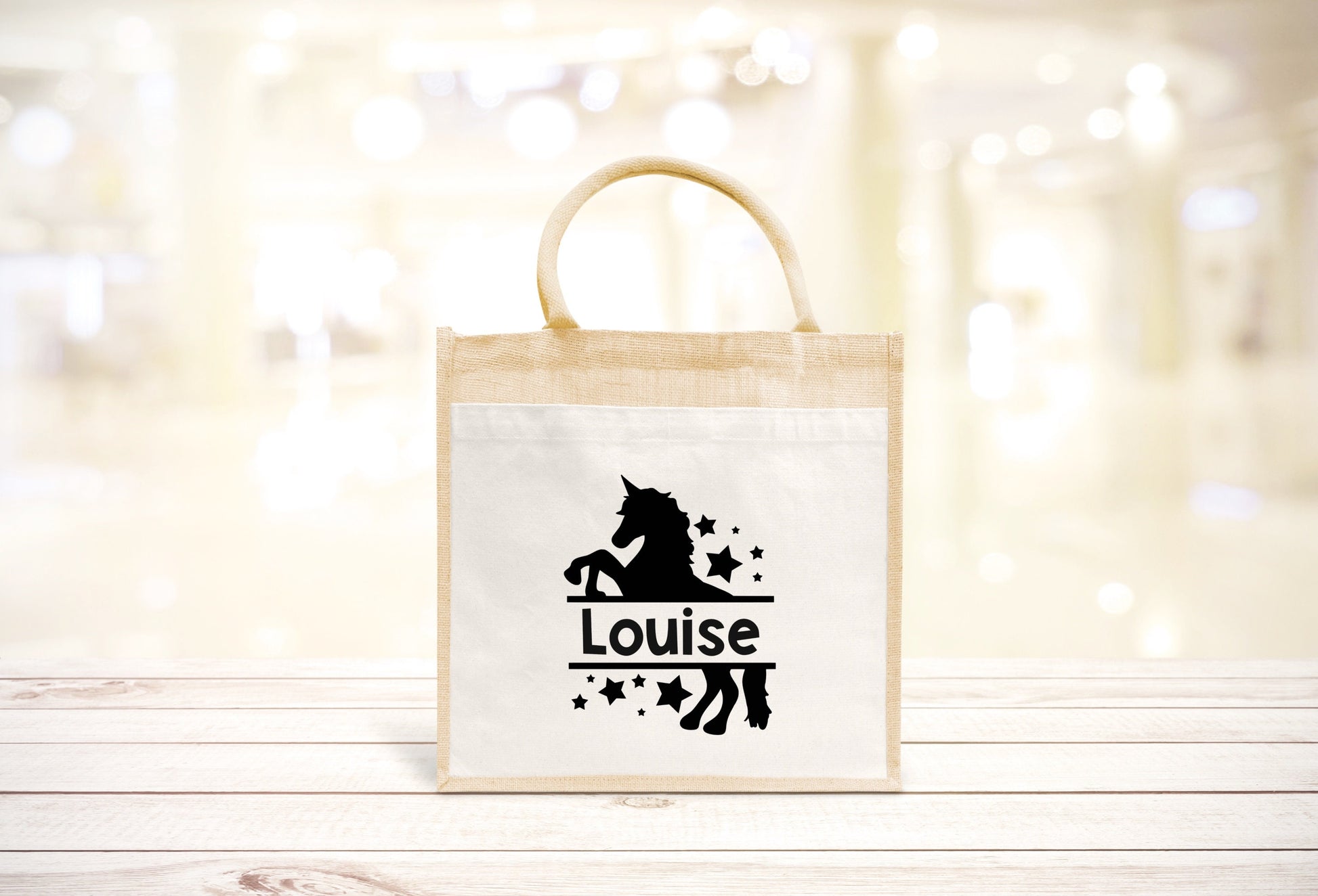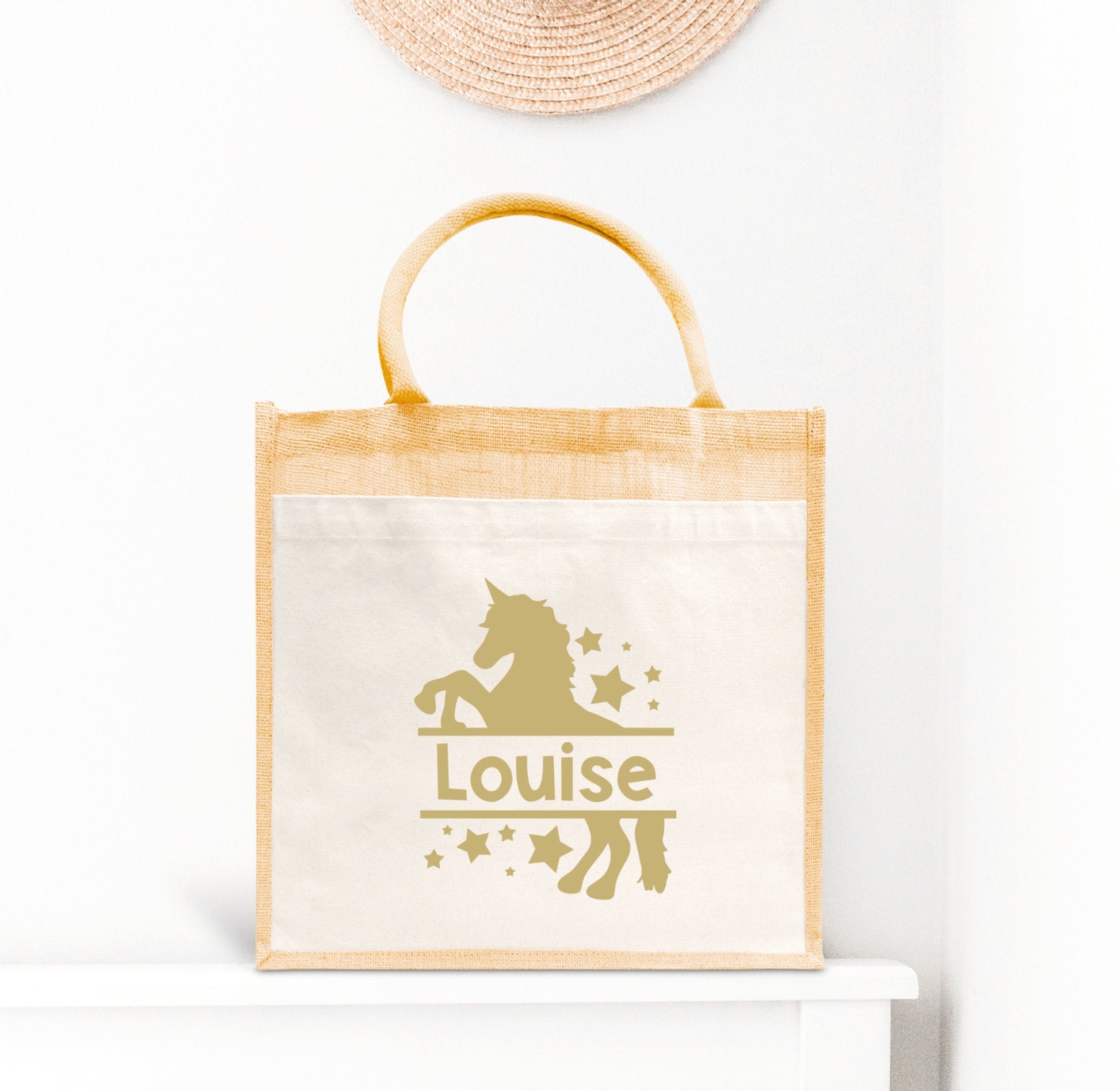 Sac Cabas toile et jute enfant personnalisé, Cadeau enfant prénom, Cadeau anniversaire enfant, Sac licorne
