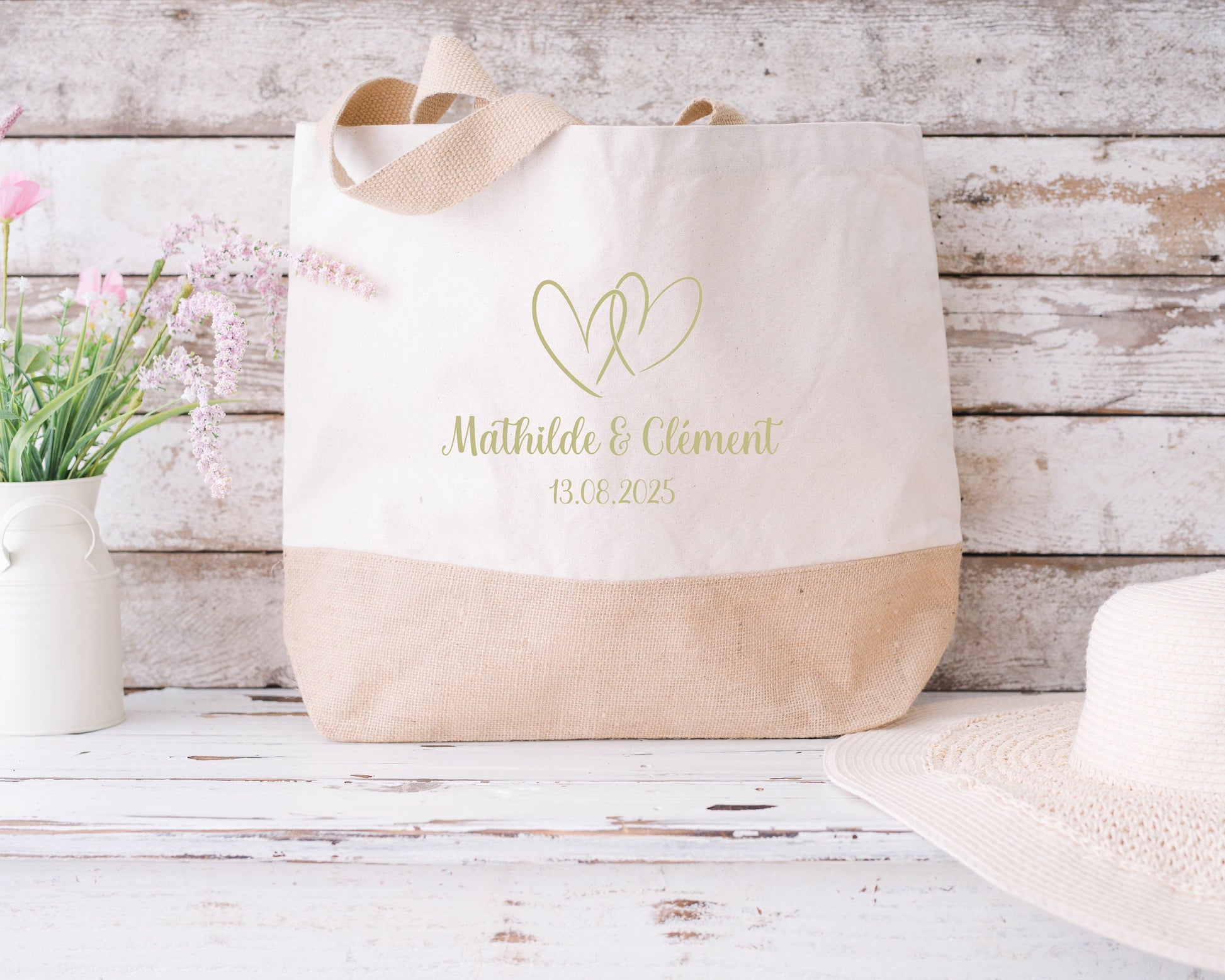 Sac en jute et coton personnalisé mariage, Sac EVJF, Sac de la mariée, Cabas personnalisé mariage